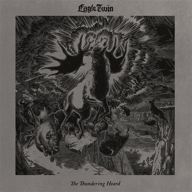 Eagle Twin’s commanding sound delivers like a tectonic force, where doom and blues collide. Gentry Densley’s dominating low-end vocal tone is like an instrument in itself, rumbling alongside towering riffs, and Tyler Smith’s powerful rhythmic propulsion. It is a compelling combination, particularly when you add melodious bluesy romp to the equation. Equally prevailing are the stories that shape Eagle Twin’s musical output, drawing upon folklore, and also strongly informed by recent happenings in the world. Observing our relationship to nature, and the band’s own surroundings in the dead salt seas of Utah are themes that feature frequently across their musical canon. The Thundering Heard continues where the previous album, The Feather Tipped The Serpent’s Scale ended. In the band’s own words… “As the great snake grew giant fractal antlers of snakes and turned in upon itself creating a new world, the mountains rise, and the antlers stab through like trees across the landscape. The record begins with the hoofed and horned animals of our world running from mountains and forests on fire. Eerily harkening to the recent events in California and the massive devastation by fire across the land.”