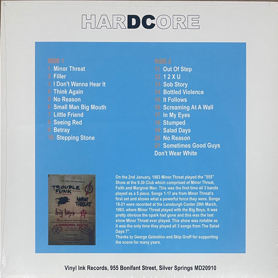 On the 2nd January, 1983 Minor Threat played the '555' Club which comprised of Minor Threat, Faith, and Marginal Man. This was the first time all three bands played as a 5 piece. Songs A1 to B17 are from Minor Threats first set and shows what a powerful force they were. Songs B18 to B21 were recorded at The Lansburgh Centre 29th March, 1983, where Minor Threat played with The Big Boys. It was pretty obvious the spark had gone and this was the last show Minor Threat ever played. This show was notable as it was the only time they played all 3 songs from the Salad Days 7".